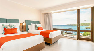 Rooms feature two double beds with furnished, private balconies and a 48” TV. All rooms include a bathtub and offer an island view.