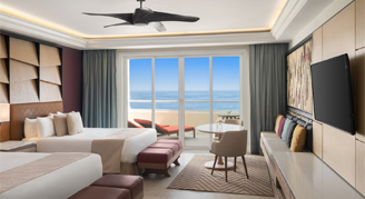 Indulge in the ultimate relaxation and luxury, and enjoy extra space in this luxurious, two-bedroom suite featuring two-and-a-half baths and a balcony with views of the resort. Suites feature modern decor inspired by the islands and include butler service.
