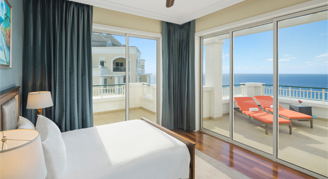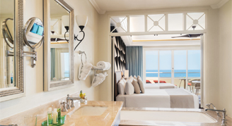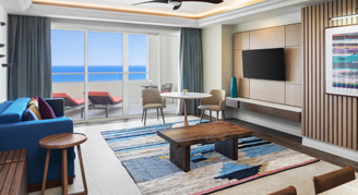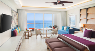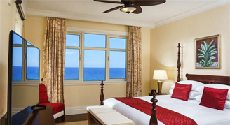Suites are located on floors seven and higher, and feature a view of the ocean. Additional amenities include Jamaican-inspired design with modern decor, a mini-fridge stocked with beer, soda and water; a coffee/tea brewer with premium roast coffee and tea, large flat screen HDTVs, an in-room safe, individual climate control, luxury bath products, luxe linens and plush bedding and a large sitting area.
