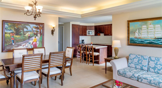 Suites feature ocean views and include a fully equipped kitchen highlighted by stainless-steel appliances like a refrigerator and microwave, coffee and tea. Bedrooms are well-appointed with plush beds featuring luxe linens, and spacious bathrooms include granite countertops and bath products. Two-bedroom suites start at 1,400 square feet and have two-and-a-half or three bathrooms and include butler service. Rollaway beds are available for an additional charge.