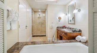 The luxuriously appointed master bedroom features a king-size bed, fine luxury linen, in-suite washer/dryer, a separate living and dining area with a fully equipped kitchen. The open bath with soaking tub is perfect for relaxing and unwinding.