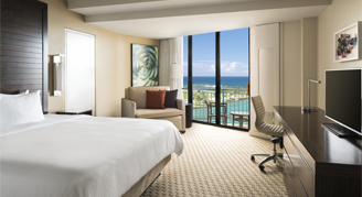 This high-floor Family Connect Suite features two private balconies with premium ocean views. Designed for families, the layout includes two connecting rooms with two full bathrooms, offering a flexible bedding configuration of one King and two Double beds.