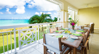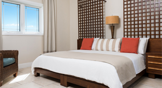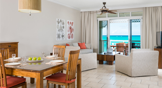 The Two-Bedroom Oceanfront Suites feature balconies or terraces with direct ocean views facing Grace Bay Beach. The master bedroom comes with a king or queen bed, a flat-screen TV and a full ensuite bathroom with a separate tub and shower. The second bedroom offers two twin beds, a flat-screen TV and a bathroom with a separate tub and shower. The living room features a sleeper sofa, a half bathroom and a flat screen TV.