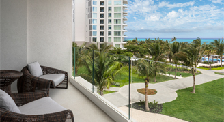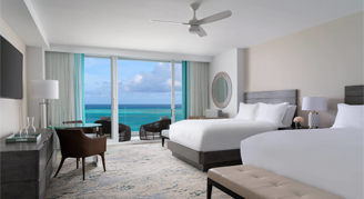 Elegant décor inspired by the islands. Rooms feature a spacious open layout, a bedroom with two queen beds and a private balcony with a sitting area offering panoramic oceanfront views of Grace Bay Beach.
