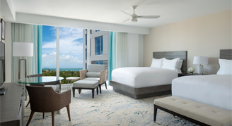 Elegant décor inspired by the islands. Rooms feature a spacious open layout, a bedroom with two queen beds and a private balcony with a sitting area offering panoramic ocean views of Grace Bay Beach.