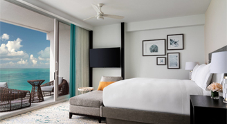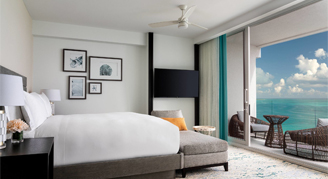 Elegant décor inspired by the islands. Rooms feature a spacious open layout, a bedroom with one king bed and a private balcony with a sitting area offering panoramic ocean views of Grace Bay Beach.