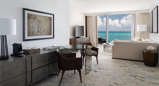 Elegant décor inspired by the islands. Suites feature a full parlor area with a dining table, expansive living room, a bedroom with one king bed and a spacious balcony with a sitting area offering panoramic oceanfront views of Grace Bay Beach.