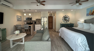 Studio accommodates up to two people and features full residential amenities in a tropical beach setting, and will have a combined living/dining/sleeping area with a private bathroom. Ground units feature a patio and second and third floor units feature a balcony.