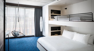 Characterized as a modern room with a loft feel, urban design, high ceilings and a large bathroom. These hotel rooms feature full windows for viewing Denver's LoDo District. Bunk beds are configured with a king bed bottom and twin bed placed perpendicularly, providing innovative space for relaxation or composition. Handcrafted amenities include high-end bath products, a pour-over coffee system, and smart TV programming. This room provides the tools you need to curate an unforgettable experience.