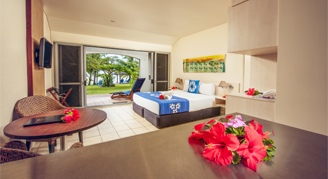Accommodations consist of studios and one-bedroom suites located either directly beachfront or among the lush tropical gardens and near one of the resort's two swimming pools. Room amenities include Wi-Fi, air-conditioning, a kitchenette complete with a two-burner cooktop, microwave, fridge/freezer, and insect screens. Rooms also have a telephone, smart TV, en suite bathrooms with toiletries and all linen including beach towels, a private patio or balcony with lounger and deck chairs. Please note that TVs offer local channels only.