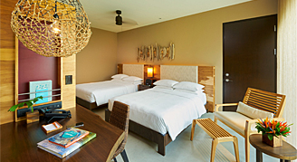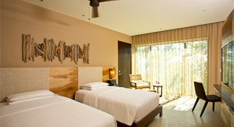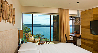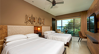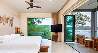 Rooms, suites and villas offer a modern design blended with woven textiles, solid woods, and carved artifacts that highlight the rich Costa Rican scenery. Bathrooms feature a walk-in rain shower that opens to the balcony and deluxe amenities. A highlight of Costa Rica is the emphasis that is placed on protecting and preserving the environment. Rules are strict, and trees and other foliage may not be trimmed, cut or removed without government authorization. Therefore, at certain times of the year, growth may be thick, resulting in obstructed views from hotel guestrooms.