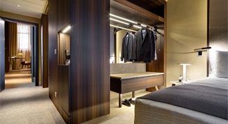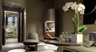 The Superior ME Extra Space Room offers a true contemporary design experience with furnishings by great Milanese masters of interior design, such as Oluce lamps, armchairs and eucalyptus wood furnishings by Molteni & C.