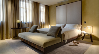 The Superior ME Room offers a minimalist design with furnishings by great Milanese masters of interior design, such as Flaminia lamps, armchairs and eucalyptus wood furnishings by Molteni & C.