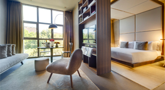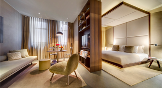 Simple, elegant Always ME rooms offer a true contemporary design experience with furnishings by great Milanese masters of interior design, such as Oluce lamps, armchairs and eucalyptus wood furnishings by Molteni & C.