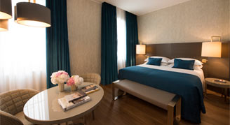 Deluxe rooms are chic and modern, dressed in a warm elegance, with oak floors, working desk and interactive Smart TV. The bathroom, in light marble or porcelain stoneware, are treated in detail.