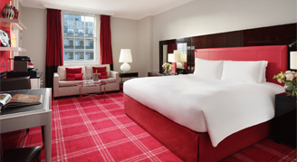 Effortlessly blending pop-art culture, French modernism and British old-world elegance, Sofitel London St James abounds in rich colors of British heritage shades of green, blue, red and purple, accented by lacquered mahogany furniture and thick carpets.