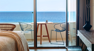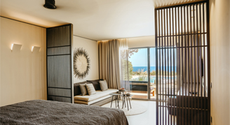 Double room with sea view, recently renovated in a modern boho style. Embrace a deeper connection to nature, just steps from the pool, green lawns and views of Mirabello Bay.