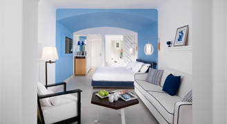 These spacious rooms feature Aegean inspired ambiance, all made with the finest quality of Greek Marble and the iconic colors of Mykonian architecture, white and blue.