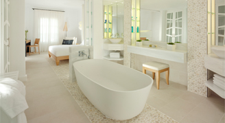 Situated on the ground or first floor, rooms feature the Wet Experience bathroom consisting of a 30 cm rain shower and a contemporary, free-standing designer bathtub, next to a sliding door to allow daylight and sea views.