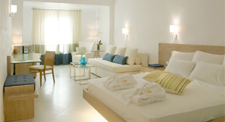 The hotel is located on a private peninsula between two beaches (Platis Yialos and Psarou Beach). Platis Yialos is the only beach that provides water taxi access to the popular beaches of Paradise, Super Paradise and Agrari.