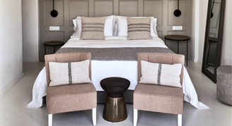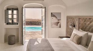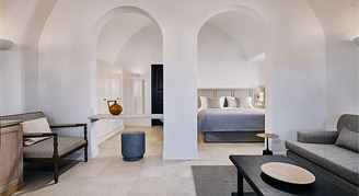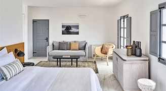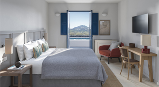 Suites feature a view of the island with windows opening to a lightly furnished balcony. A soothing color palette welcomes guests into the brand-new Ionian Suites, embodying the native Santorinian style and reflecting the island's refined atmosphere.