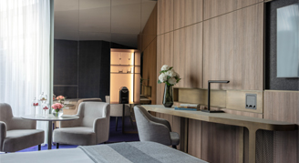 Junior Corner Suites feature an open scheme for lounging, with natural lighting that makes the room feel larger. A rollaway bed can be provided for a third guest.