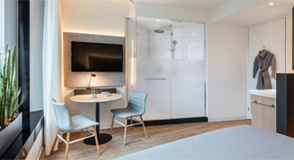 A room between floors 3 - 11 with a king-size bed, a desk and a TV with Chromecast so you can enjoy endless streaming.