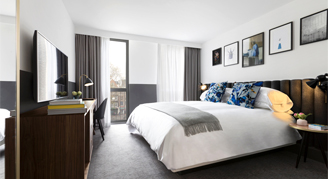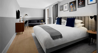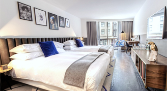 Guestrooms are decorated with minimalist flair and a palette of bold green and blue colors, with lush textures alongside the elegance bathroom amenities and cozy comforts. All guestrooms feature Nespresso machine, custom Kimpton ultra-comfort mattress from Hypnos, rain shower and handheld showerhead, work desk, Bluetooth speaker, alarm clock, and complimentary Wi-Fi for all guests.