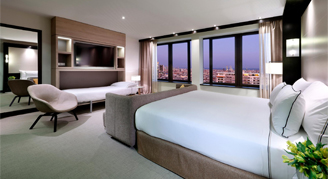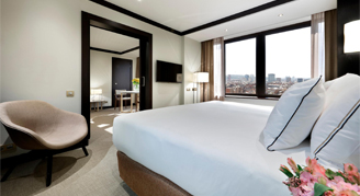 Larger than the Junior Suites, Suites feature a separate seating area and view of Barcelona from the upper floors of the hotel.