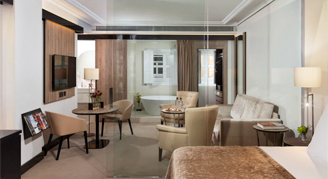 Views overlooking the hotel's private patio, these rooms offer a fully fitted bathroom with underfloor heating, bath and rain shower, and a living space in an elegant design.