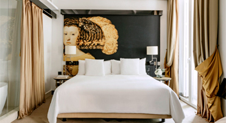 Room décor is inspired by Las Meninas, the Velazquez masterpiece. Sharp, clean lines and fine textiles have been used to recreate classical elegance with a modern flair.