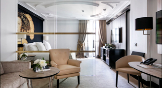 Suites feature a separate lounge area with elegant decor.