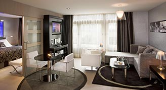 A large room with a bold design in the bedroom and a sophisticated separate lounge. Soak in all the exclusivity of details such as your whirlpool bathtub and enjoy all the extra details provided by The Level service during your stay.