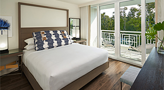 Located in the Coconut Wing, this cozy Junior Suite provides guests a door between the king bedroom and comfortable sitting room with a pull-out sofa bed. Suites feature nature-inspired decor, views of the treetops and guest arrival areas from an open-air terrace, two 50-inch flat-screen TVs, and a coffee maker. All-natural Lather® bath amenities, including curated Baker's Cay Salt Scrub, round out the in-room amenities.