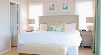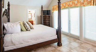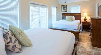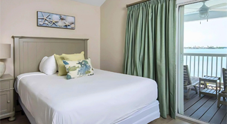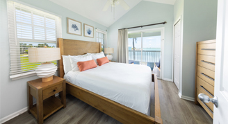 This villa features 1,350 square feet of living space (1,700 square feet with balcony), which includes a living and dining room, full kitchen and two bedrooms. Select villas include a pull-out sofa for additional sleeping space. The wraparound porch has resort or marina and water views. Bedding may vary by villa. Sleeps four guests comfortably.
