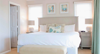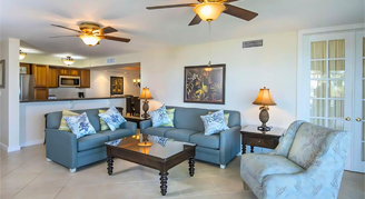 Recently refreshed single-level villa with a king bed in the master bedroom, two queens in the second bedroom and one queen bed in the third bedroom. Features an open layout, kitchen, dining area, and living room with queen sleeper sofa. Wraparound screened porch. Bathroom count varies by unit.