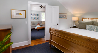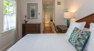 Located on the third floor of the main house at Marquesa, accessible by stairs only. This private suite includes a king bed, separated by a door from the living area with a sofa bed, a seating area and window seats, a desk, two flat-screen TVs, a luxe marble bath, and central air conditioning.