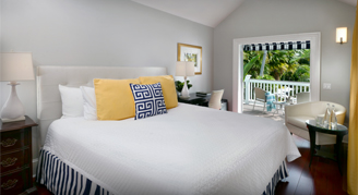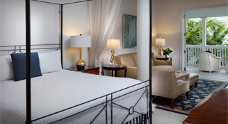 Located at the original Marquesa, Junior Suites feature an open floor plan with a king bed, a spacious sitting area with a sofa bed, a modern bathroom with a tub and shower, and a covered porch including a dining table and lounge chairs.