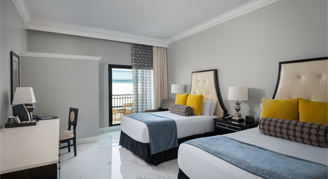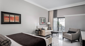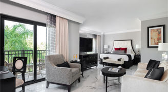 Two-bedroom two-bathroom suite with a separate living room. This suite overlooks Fifth Avenue with 600 sq feet of balcony space and all the appropriate furniture to enjoy the lively street and relax in the sun.