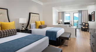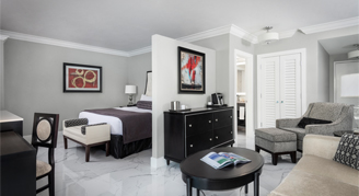 Two-bedroom two-bathroom suite with a separate living room. This suite overlooks Fifth Avenue with three separate balconies.