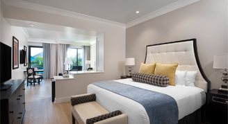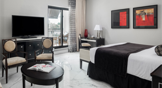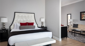 Beautiful and spacious suite elegantly appointed with 150-year aged French oak flooring and featuring a private balcony. Accessible features include toilet grab bars, accessible sink, vanity and desk, and visible notification for phone, door, and alarms.