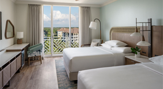 Guest rooms feature partial-bay views, a full balcony with sitting chairs, sliding glass doors and contemporary decor.