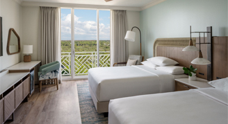 Guest rooms feature a partial view of the bay with a step-out balcony, sliding glass doors and contemporary decor.