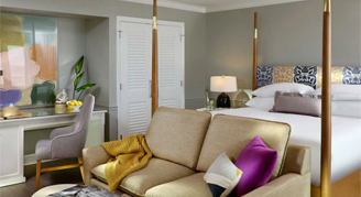 Sophisticated comfort awaits, boasting views of tropical landscaping and cascading pools.