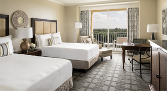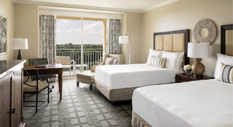 Rooms feature views of resort grounds and lush landscaping from your personal balcony with seating for two. Inside, relax on two double beds with plush feather bedding and down duvets. Additional amenities include a full white marble bathroom with lighted mirror, soaking tub, separate shower, Diptyque bath products, and essentials. Plus two plush terry robes with comfortable slippers.