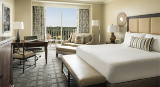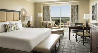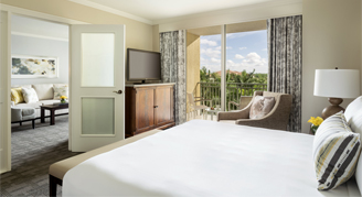 Rooms feature views of resort grounds and lush landscaping from your personal balcony with seating for two. Inside, relax on a king bed with plush feather bedding and down duvets. Additional amenities include large windows and doors that maximize views and natural light, a living area with a 55-inch LCD TV, a full white marble bathroom with lighted mirror, double sink and soaking tub plus a powder room, Diptyque bath products and essentials in both bathrooms, and two plush terry robes with comfortable slippers. The living room and bedroom are separated by French Doors.