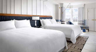 Rooms feature stunning downtown views. Unwind in style in these newly redesigned rooms complete with two plush queen beds, sleek art deco details, subtle gold and smoky blue accents, and flattering ambient lighting.
