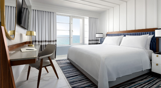 This ocean-view room sets the tone for a blissful beachside escape. These newly redesigned rooms are outfitted with flattering ambient lighting and subtle gold and smoky blue accents. If you insist on working, a stylish desk enhances your experience, while a stylish bathroom provides a great start to any day.