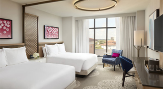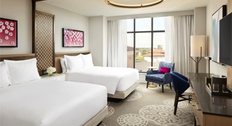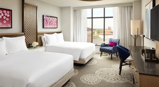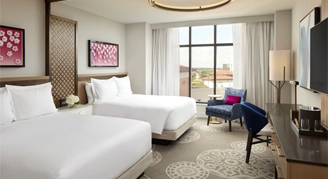 Relax with two queen beds, bathroom with oversized shower, views of Coral Gables and hearing accessible features. Visual fire alarm and notification devices are available, and an outlet within 4' of the phone for TTY (teletypewriter).