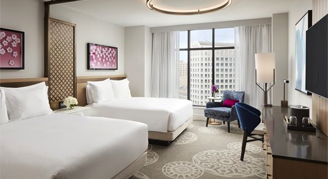 Rest comfortably with two queen beds, a bathroom with an oversized shower, city views, and hearing-accessible features. Visual fire alarm and notification devices are available, and an outlet within 4' of the phone for TTY (teletypewriter).